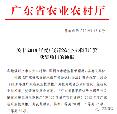 我司作為華南農(nóng)業(yè)大學(xué)合作單位之一,參與“修復(fù)農(nóng)田土壤污染的能源作物品種篩選及其配套技術(shù)應(yīng)用項目”取得了良好的綜合效益,根據(jù)《廣東省農(nóng)業(yè)技術(shù)推廣獎勵試行辦法》有關(guān)規(guī)定,經(jīng)省農(nóng)業(yè)技術(shù)推廣獎評審委員會審定,該項目獲得2018年度廣東省農(nóng)業(yè)技術(shù)推廣二等獎(粵農(nóng)農(nóng)函〔2019〕1716 號)。
